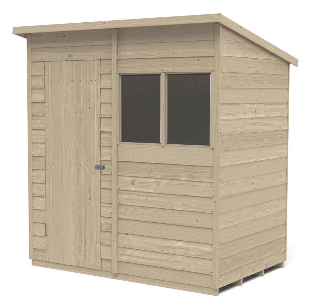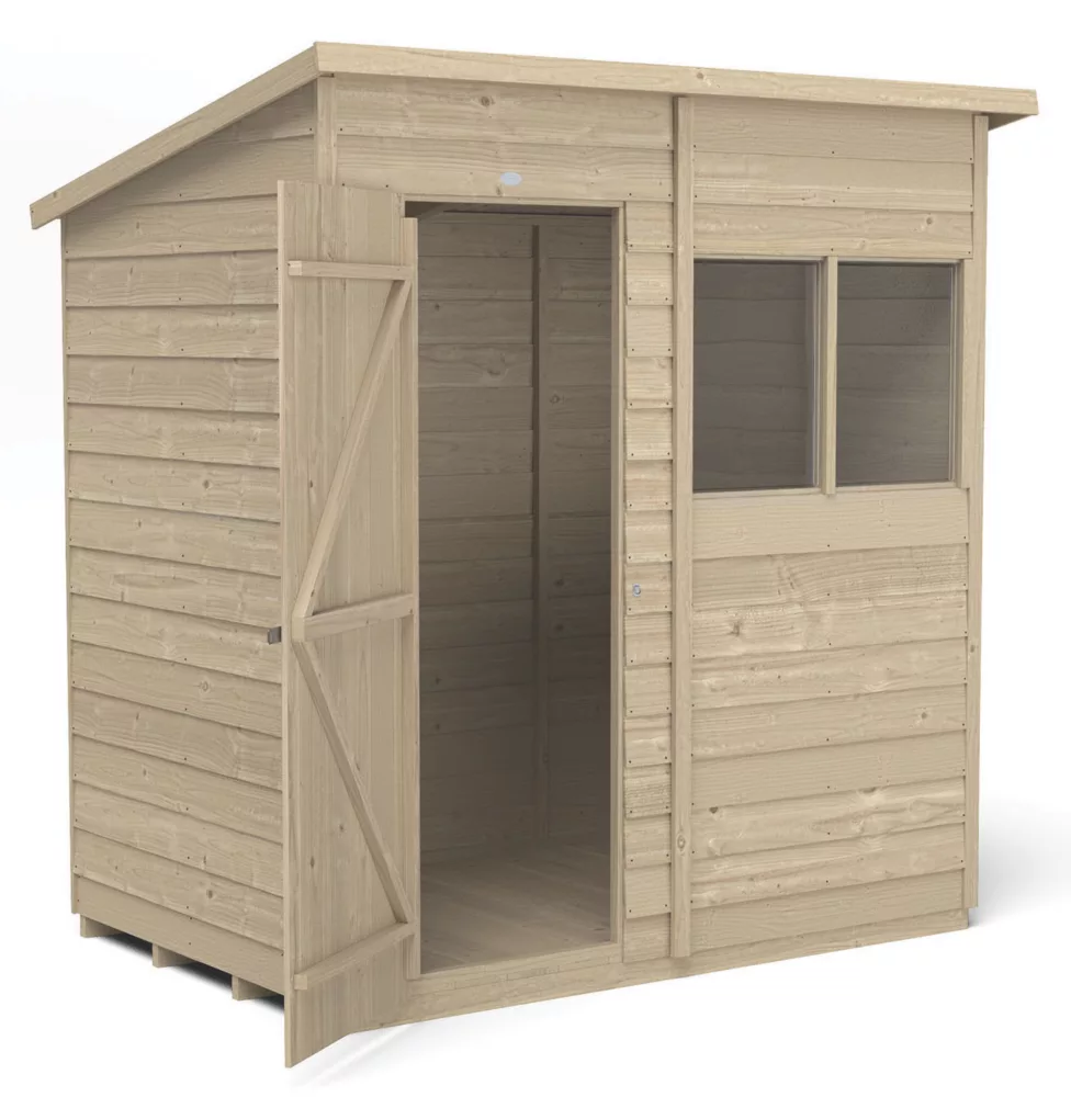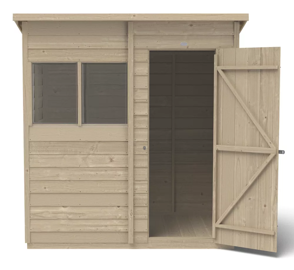 A great storage solution for all types of gardening equipment, from tools to lawnmowers. Pent roof and windows allow plenty of room and light. Roof style is perfect for situating against a back wall or fence. Design features small sections, making it easier to handle and quick and easy to assemble. Overlapped, straight-cut boards allowing for natural movement of the timber so it can adapt to the changing weather conditions and ensure rainwater run-off. Pressure-treated solid timber floor allows for the storage of heavier items like lawnmowers or bags of compost. The shed door is braced with double ‘Z’ framing for rigidity and is hung with secure hidden hinges. Fitted with a hasp and staple latch that can be padlocked (padlock not included). The 2 fixed windows are made from shatterproof PET glazing, which will not yellow or brittle over time. The door can also be hinged either side of the opening to suit the garden. The dip treatment that has been applied at the factory protects the timber (annual treatment required). Manufactured in the UK and supplied with felt and all fixtures and fittings needed to build.