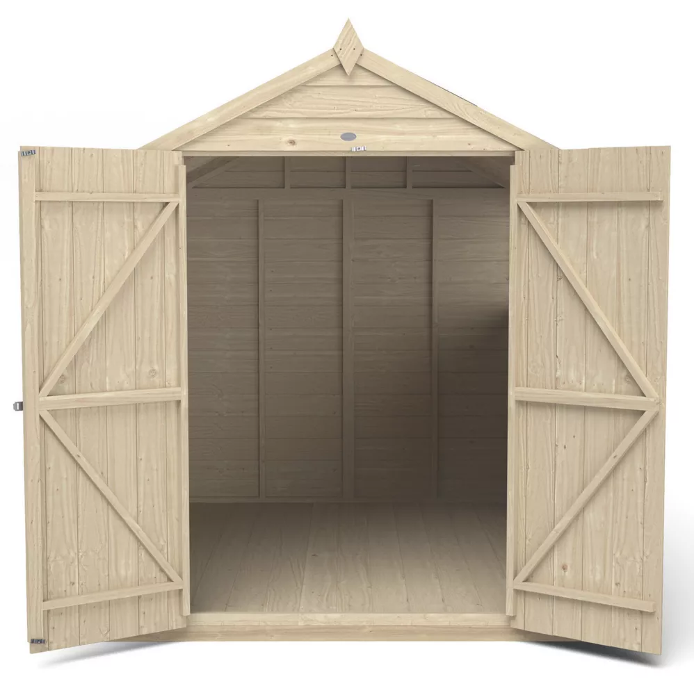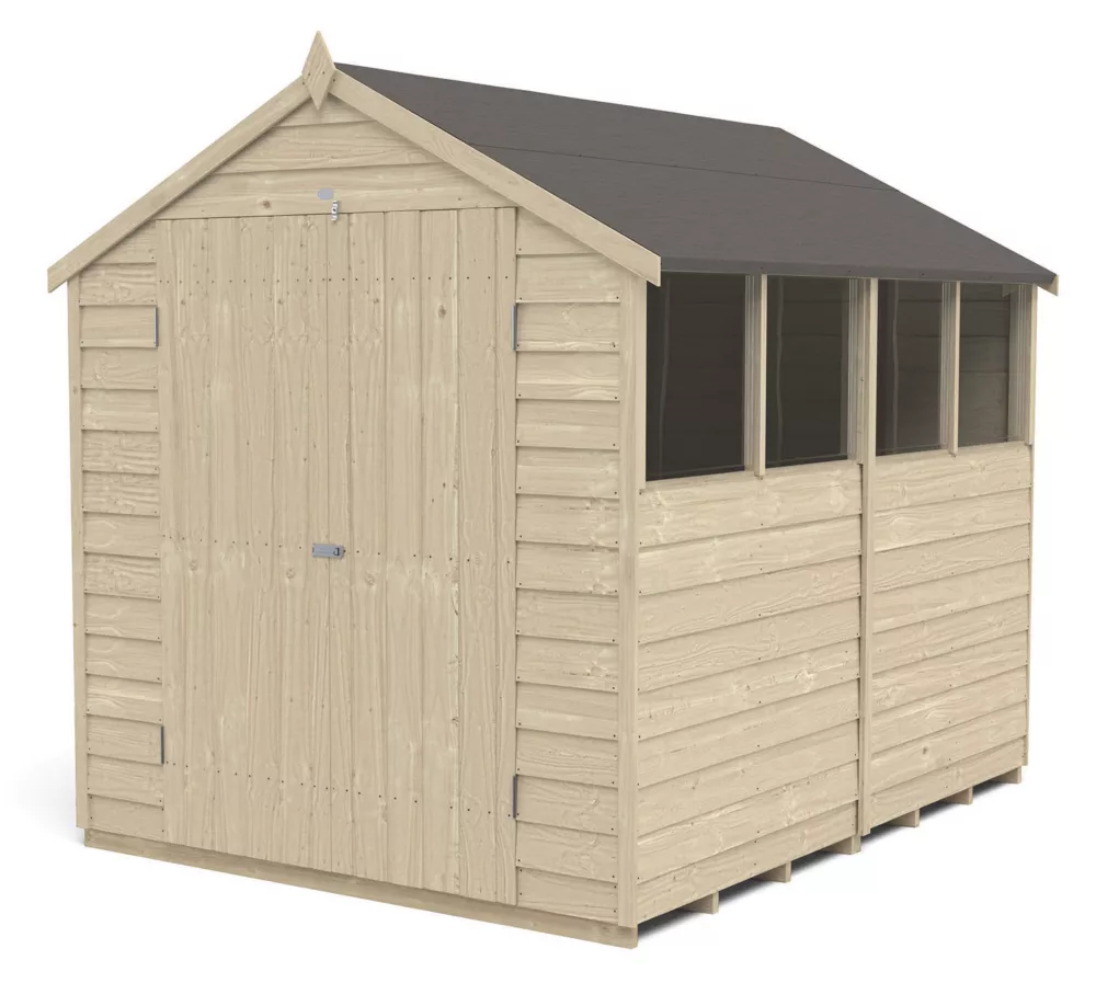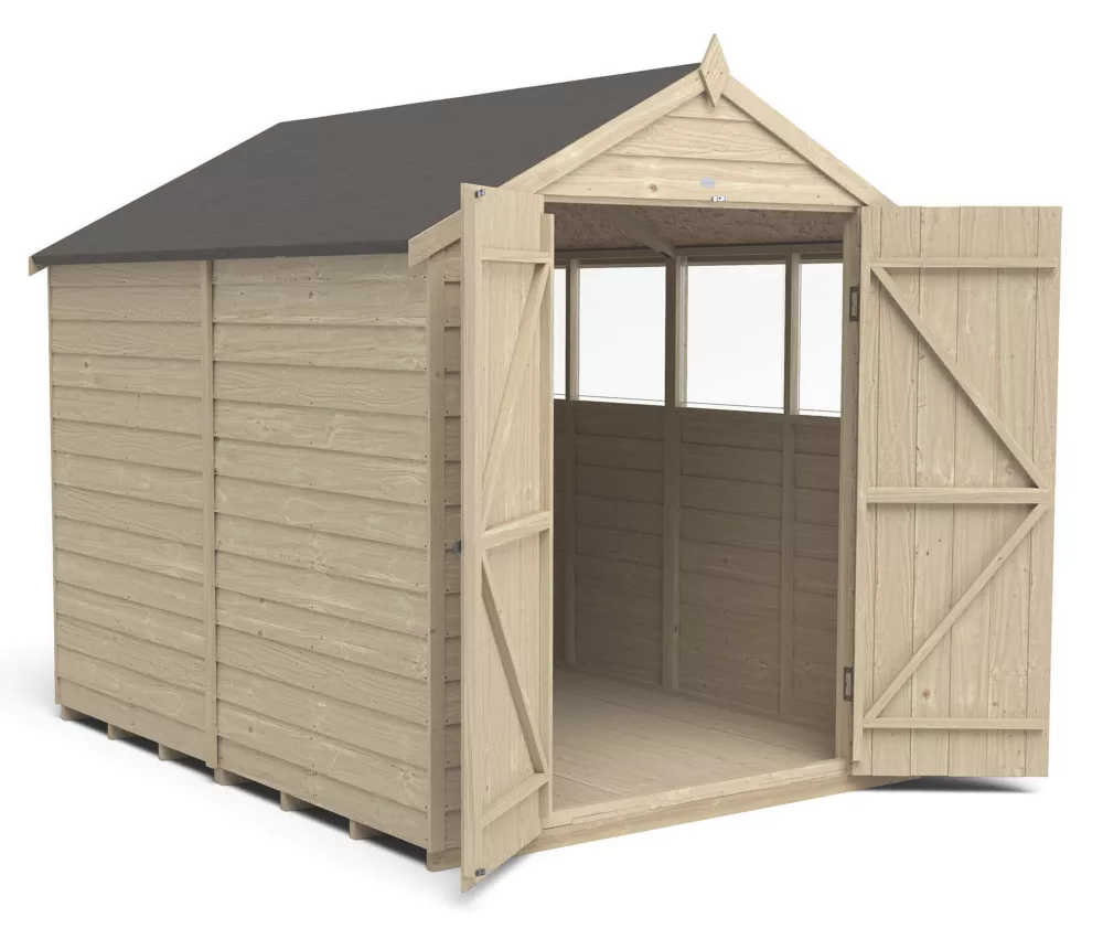 A great storage solution for all types of gardening equipment, from bikes to lawnmowers. The double doors and increased headroom ensure easy access and plenty of room to move around. Design features small sections, making it easier to handle and easy to assemble. The straight-cut boards are overlapped, allowing for natural movement of the timber so it can adapt to the changing weather and aid rainwater run-off. The doors are braced with strong double ‘Z’ framing, have secure hidden hinges and are fitted with a hasp and staple latch that can be used with a padlock. Pressure-treated solid timber floor allows for the storage of heavier items, shelving or a workbench. The 4 fixed windows are made from shatterproof PET glazing, which will not become yellow or brittle over time. This flexible shed is made up of modular sections where same size panels are interchangeable, this allows building with 4 windows down one side, or 2 windows each side. The window panels can also be set forward or backwards. The roof is made from hardwearing sheet material finished with black sand felt. The dip treatment that has been applied at the factory protects the timber from rot and fungal decay. Manufactured in the UK and supplied with all fixtures, fittings and felt needed to build.