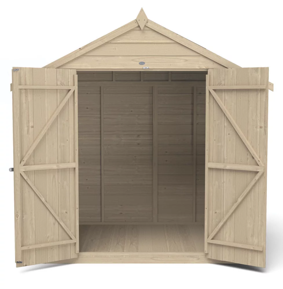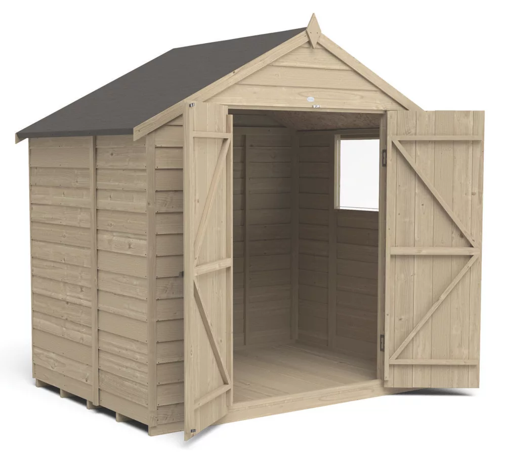 Keeps the garden clutter-free and offers a secure space for storing garden equipment. High apex for plenty of headroom inside. Design features small sections, making it easier to handle and quick and easy to assemble. Pressure-treated solid timber floor allows for the storage of heavier items like lawnmowers or bags of compost. The straight-cut boards are overlapped, allowing for natural movement of the timber so it can adapt to the changing weather conditions and ensure rainwater run-off. The roof is made from hardwearing sheet material with black sand felt and is finished with smooth-planed barge boards and decorative finial. The fixed window is made from shatterproof PET glazing, which will not become yellow or brittle over time. This flexible shed is made up of modular sections where same size panels are interchangeable, this also allows choice of which side the window panel goes during assembly, or move the window panel forward or backwards. The double doors are braced with strong double ‘Z’ framing for rigidity. They feature hidden hinges and can be secured with the hasp and staple latch for increased security (padlock not included). The dip treatment that has been applied protects the timber from rot and fungal decay. Manufactured in the UK and supplied with all fixtures, fittings and felt needed to build.