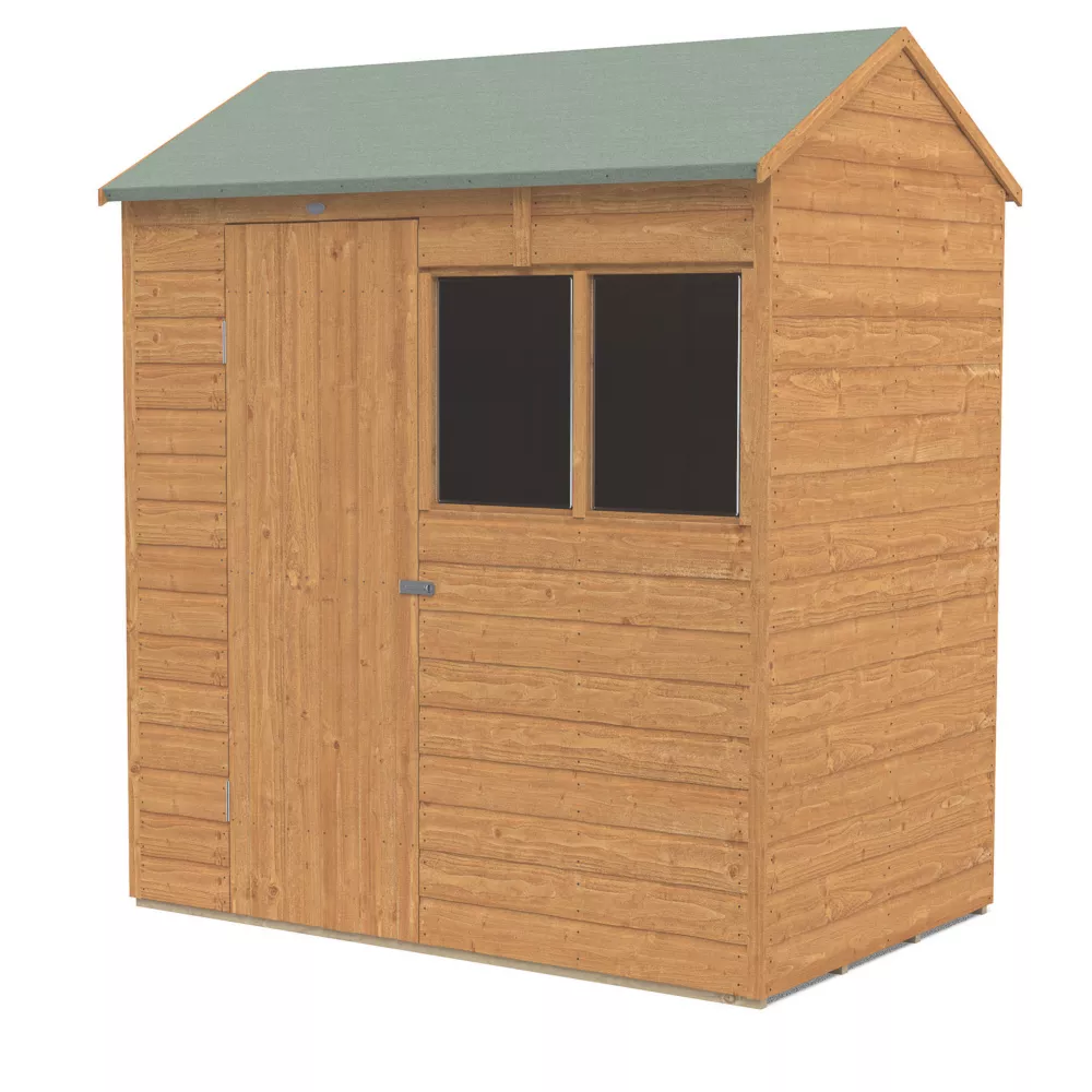 Dip-treated, compact garden shed with enough space to securely store away valuable gardening equipment. The reverse apex roof makes it ideal for positioning against a wall and allows the interior space to be used to its greatest storage potential. Small sections make it easier to handle and allows quick and easy assembly. Interlocking boards make it robust and weather-resistant. The roof is made from hardwearing sheet material finished with shed felt. The strong timber floor makes it ideal for storing heavy gardening equipment. Door is braced with double ‘Z’ framing for rigidity and hung with secure hidden hinges fitted with a hasp and staple latch that can be padlocked (padlock not included). Door can be hinged either side and to the left or the right of the window panel. The 2 fixed windows are made from shatterproof PET glazing which will not become yellow or brittle over time. This flexible shed is made up of modular sections where same size panels are interchangeable.