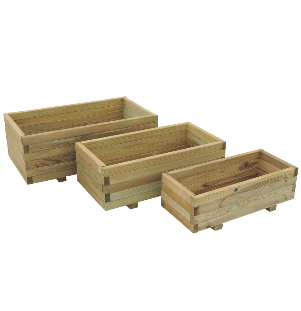 3-in-1 planter set with rectangular design. Each planter is made from pressure-treated timber to prevent rot and fungal decay. Mounted on pressure-treated bearers to prevent damp.