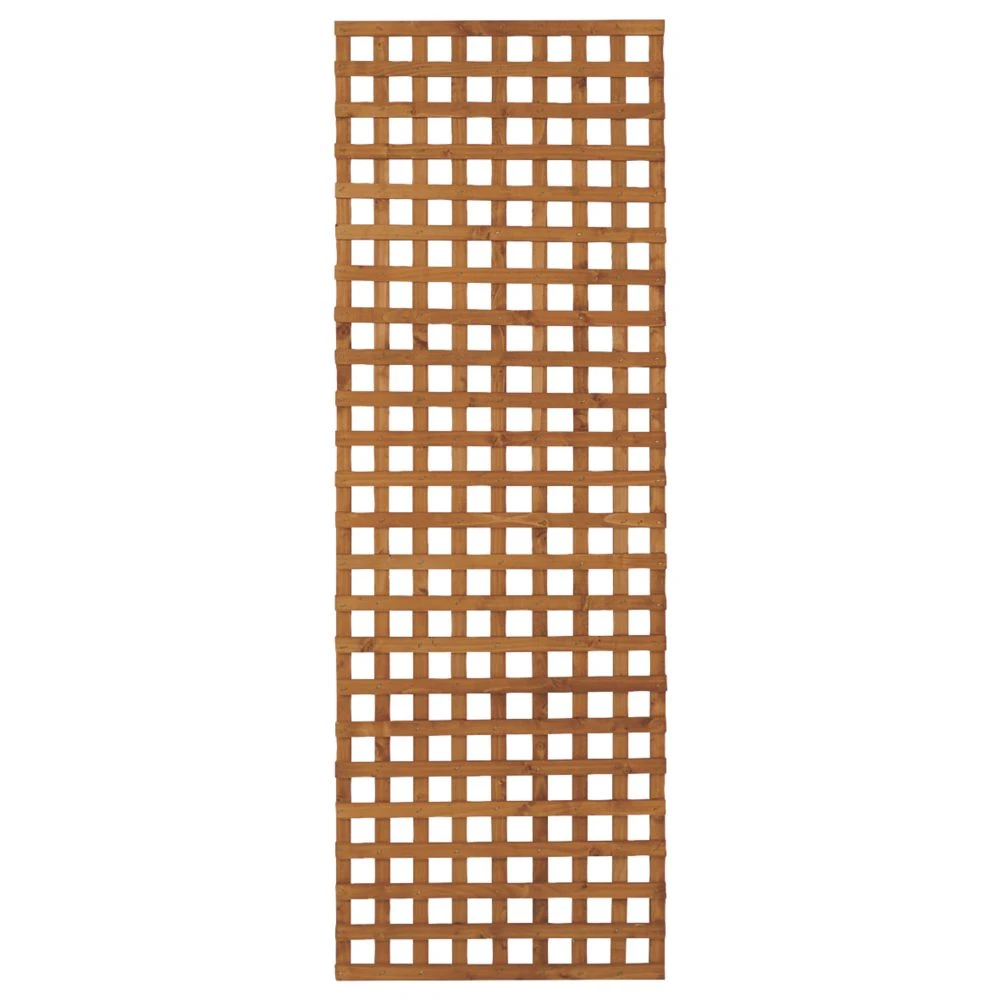 Decorative square trellis featuring tightly spaced battens for an attractive, contemporary look. The battens are 15mm thick and 30mm wide and have been dip-treated with a preservative to protect the trellis from rot and give it a golden brown colour.