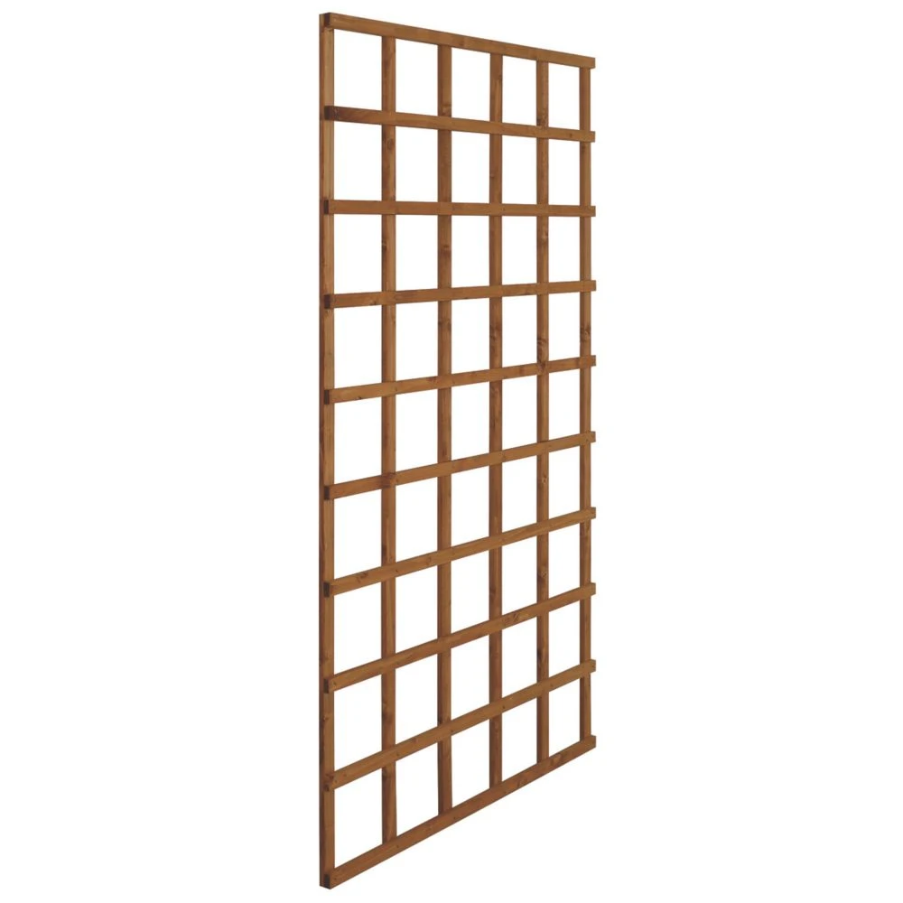 Traditional, smooth-planed square trellis with 15mm thick by 30mm wide battens which give plenty of room for climbing plants to weave between. Dip-treated with a preservative to protect it from rot and give it a golden brown colour. Suitable for mounting to a wall or fence to create a feature and train climbing plants.