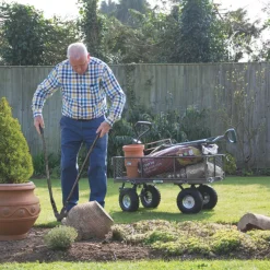 Poly garden trolley with 4 large 10 x 3″ wheels and tipping facility.