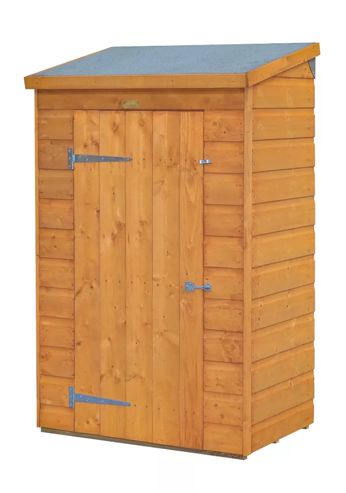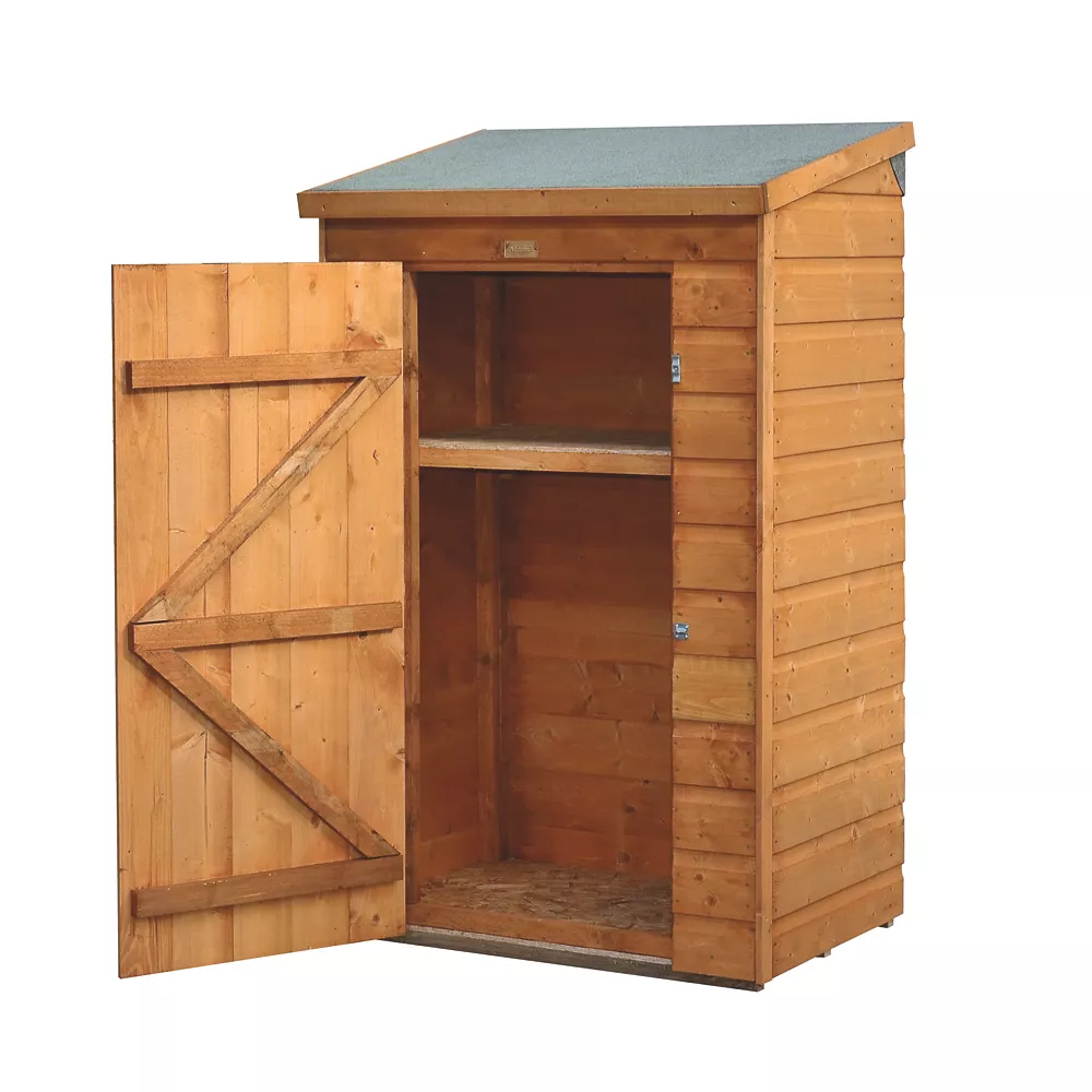 Lockable mini store, ideal for smaller gardens or patios. Provides a convenient storage solution and features a handy shelf. Supplied dip-treated in honey brown.