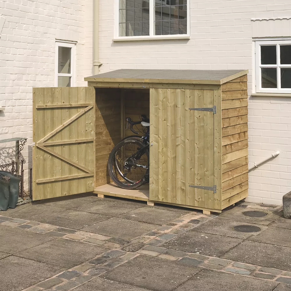 Lockable unit (padlock not supplied). Ideal for storing bikes, with wide double doors for easy access. Can also be used to store garden tools. Pressure-treated against rot for longevity. Natural timber finish.