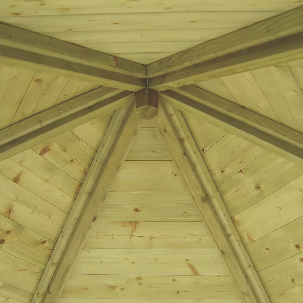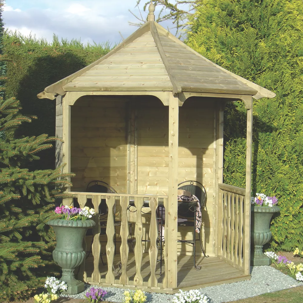 Arbour with tongue and groove profiled roof and pressure-treated timber. Supplied with shaped roof supports and floor. All necessary hardware included for easy to follow self-assembly.