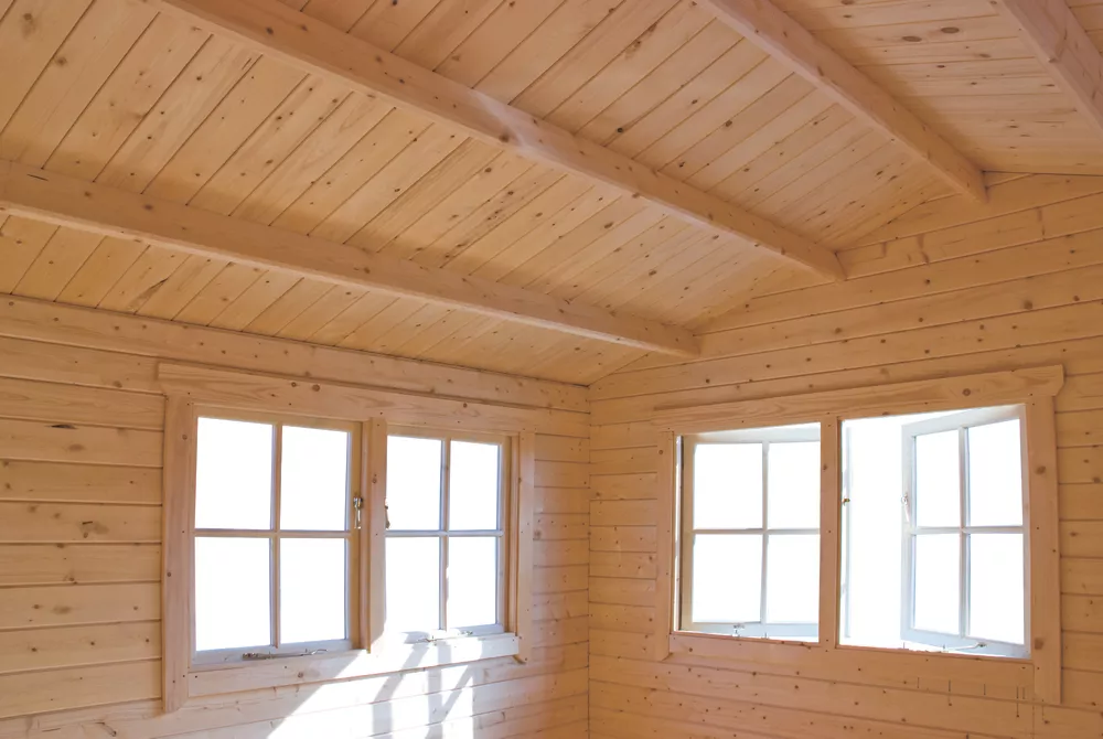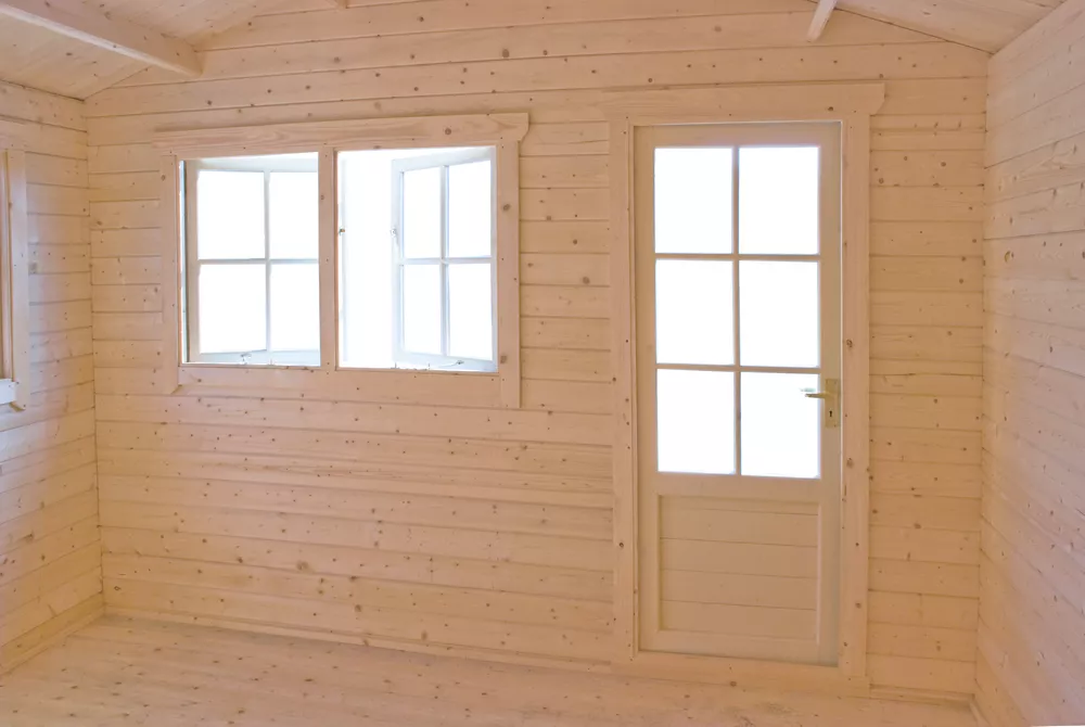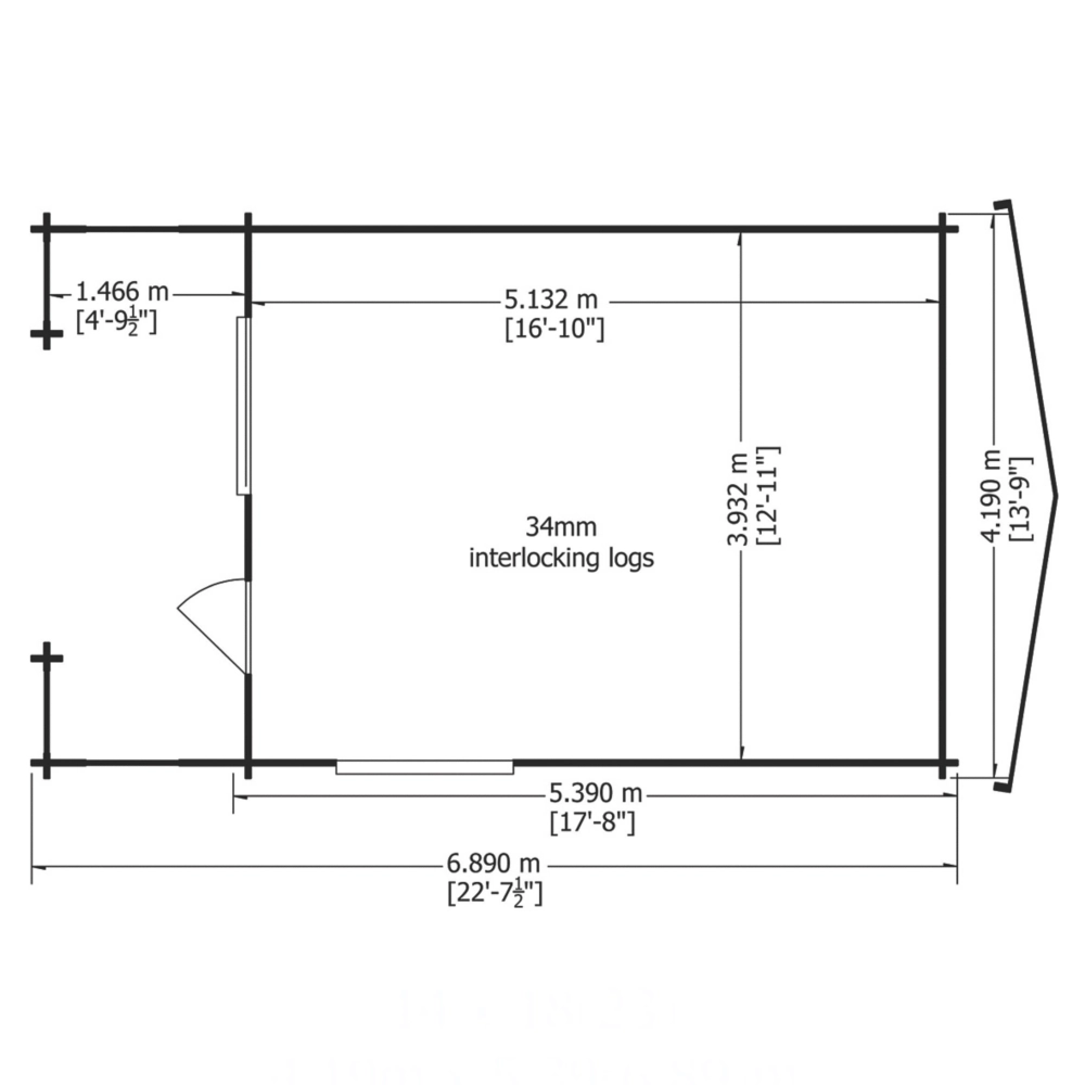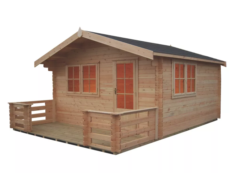 1 room log cabin with 1.5m terrace. Draught seals for doors and windows and wind block system for tight waterproof seal. Tongue and groove logs with interlocking 4 way corner joint. 19mm tongue and groove roof and floor. Flat packed. Size shown is for building only.
