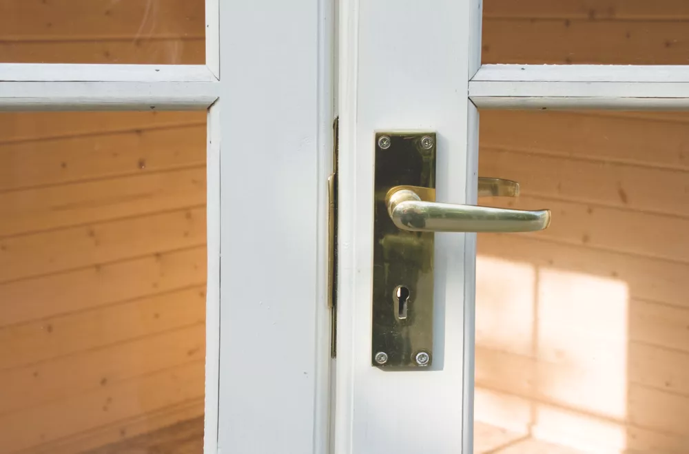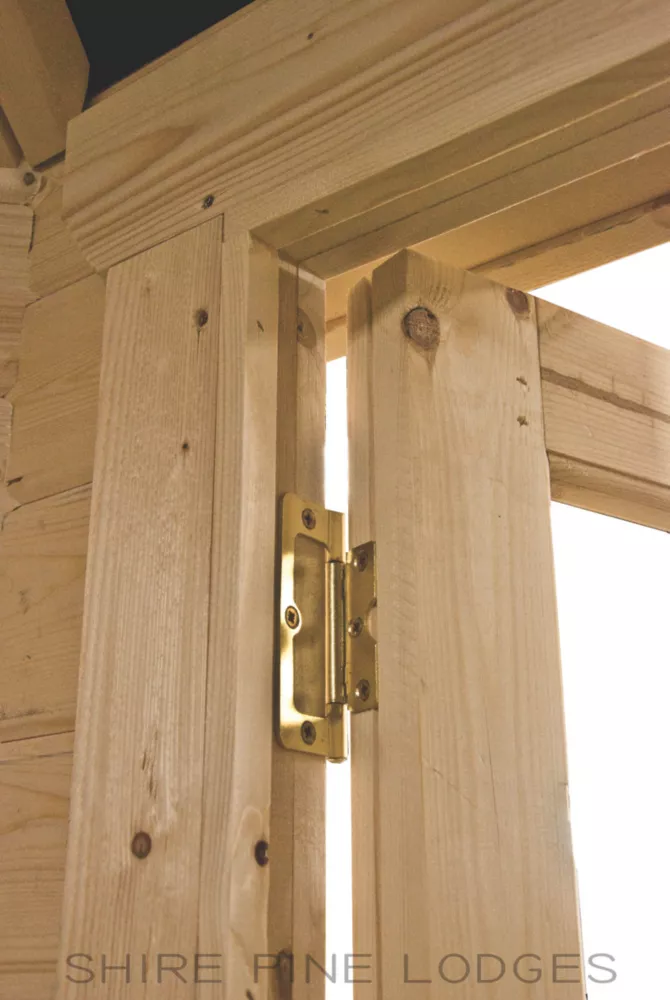 Felt roof. 28mm interlocking logs. 4 4mm toughened glass windows. Tongue and groove roof and floor. Planed timber finish.