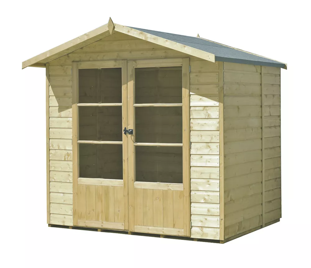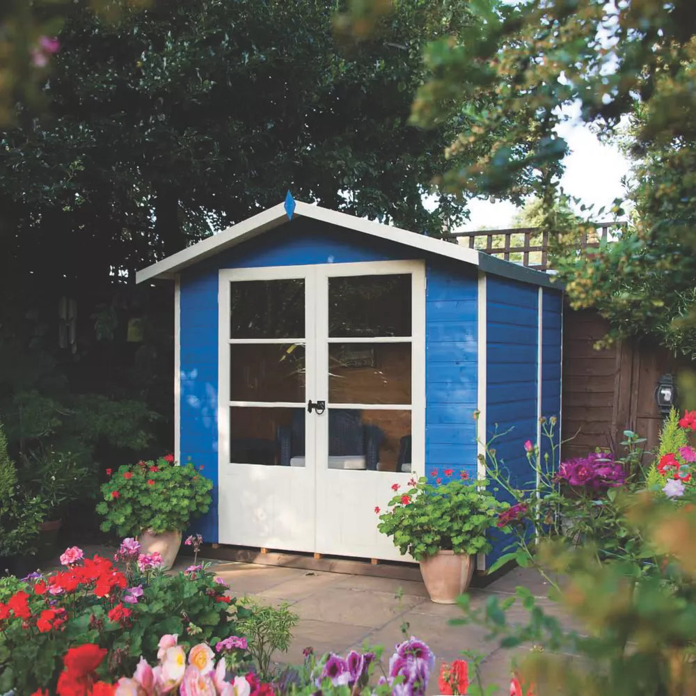 Summerhouse constructed from pressure-treated, kiln-dried, slow-grown timber. Features large, high quality, joinery-made, double-opening Georgian style doors with 3/4 length glazing.