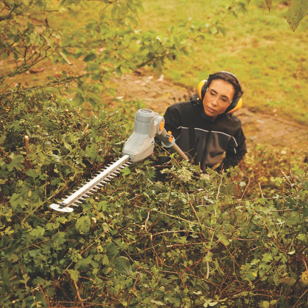 Electric hedge trimmer with telescopic shaft for set working heights and easy storage. Features laser-cut blades for a smooth, clean cut and 120° pivoting trimmer head for improved versatility. Blade tip protector and electronic quick-stop blade brake ensure user safety. Includes single shoulder harness with quick-release mechanism.