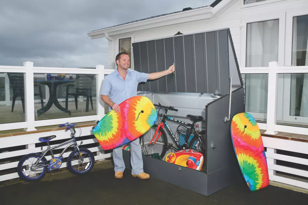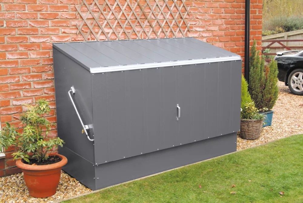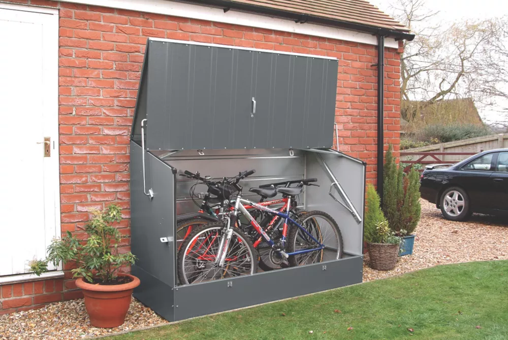 Outdoor bicycle store for the secure, safe and tidy storage of up to 3 adult bikes. Features spring-assisted opening action for complete accessibility and 2 padlock points, protecting bicycles from both weather and thieves. Designed to be bolted down onto a hard (concrete) surface from the inside and manufactured in the UK from PVC-coated galvanised steel, offering fire-resistance and no maintenance required. Suitable for most types of racing, mountain, hybrid or childrens cycles. Supplied with galvanised metal floor.